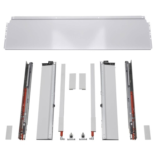 TANDEMBOX ANTARO Pan drawer pack contains: Drawer runners, drawer sides, steel back, gallery rails and fixing brackets