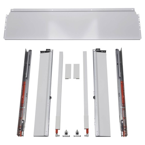 TANDEMBOX ANTARO Pan drawer pack contains: Drawer runners, drawer sides, steel back, gallery rails and fixing brackets