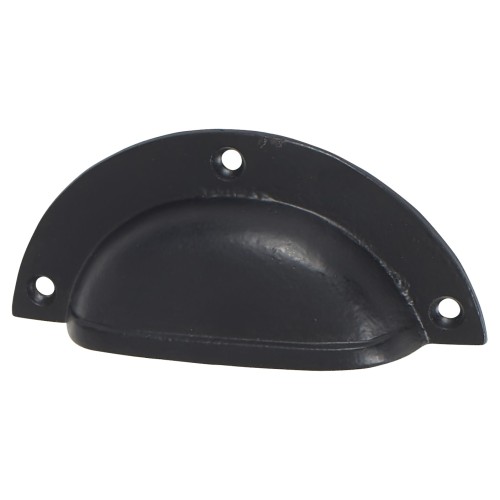 Vintage style lipped cabinet cup handle manufactured from cast iron and a black powder coating for a