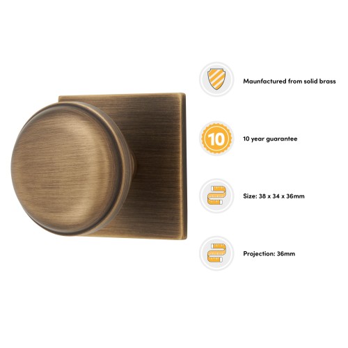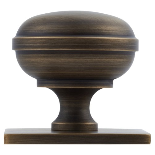 • Alexander & Wilks Quantock Cabinet Knob on Square Backplate - 34mm Diameter - Antique Brass