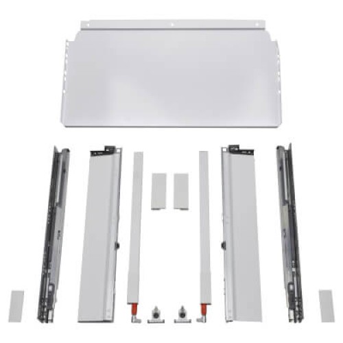 TANDEMBOX ANTARO Pan drawer pack contains: Drawer runners, drawer sides, steel back, gallery rails and fixing brackets