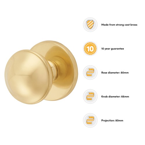 Exel Round Centre Door Knob - 80mm Rose Diameter - Polished Brass