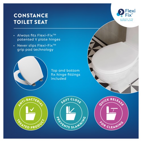 • This inventive Flexi-Fix™ toilet seat ensures a good fit that never slips out of place