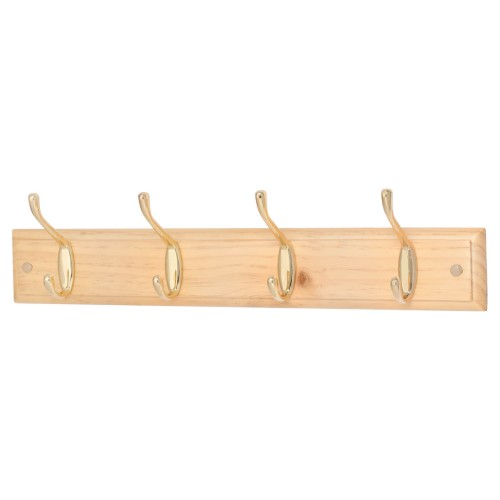 Exel Hat & Coat Hook Rail - 450 x 70 x 15mm - 4 Hooks - Pine Board with Polished Brass Hooks