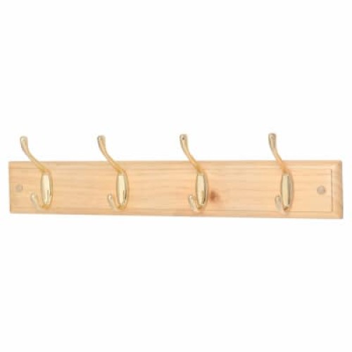 • Exel Hat & Coat Hook Rail - 450 x 70 x 15mm - 4 Hooks - Pine Board with Polished Brass Hooks