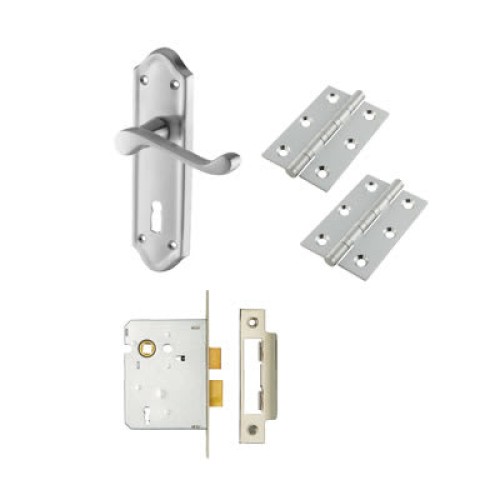 Each kit contains everything you need for one door: 1 x pair of handles, 1 x pair 75mm hinges, 1 x 3 lever sashlock (case size 76mm, backset 57mm)
