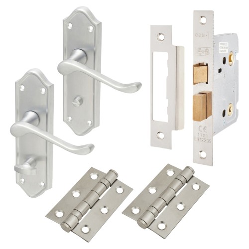 • Each kit contains everything you need for one door: 1 x pair of handles, 1 x pair 75mm hinges, 1 x bathroom lock (case size 76mm, backset 57mm)