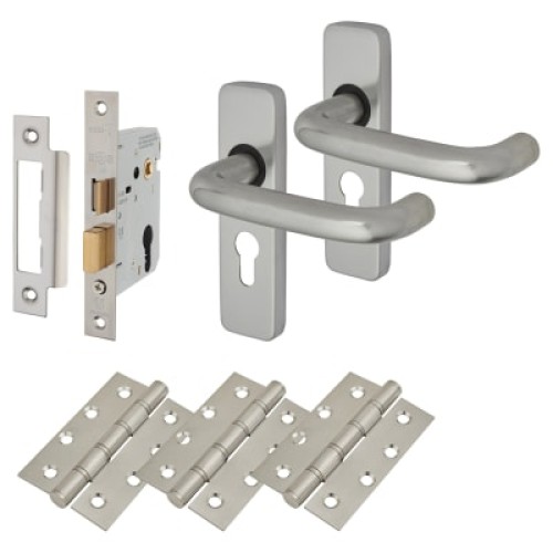 Each kit contains everything you need for one door: 1 x pair of handles, 3 x 100mm stainless steel hinges, 1 x euro profile lock (case size 76mm, backset 57mm)
