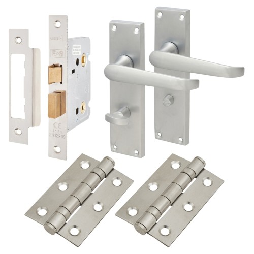 Each kit contains everything you need for one door: 1 x pair of handles, 1 x pair 75mm hinges, 1 x bathroom lock (backset 57mm)