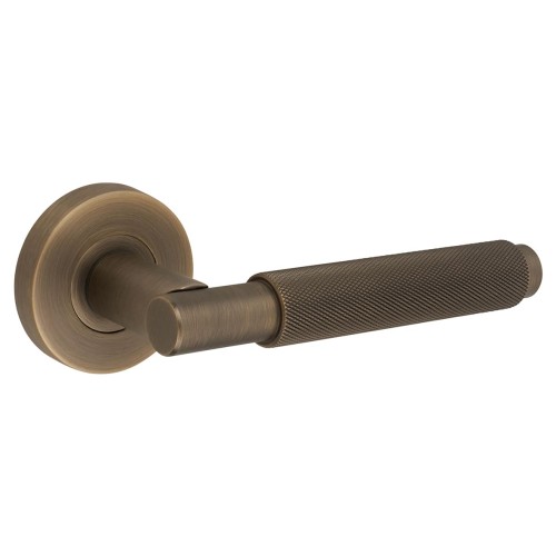 Jigtech Matt Antique Brass Knurled Door Handles on Round Rose - Textura Range