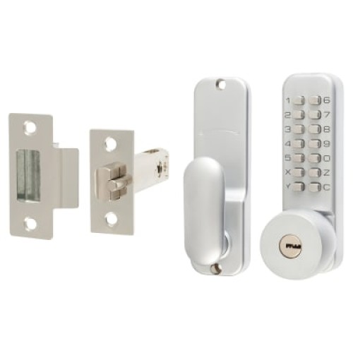 Exel Push Button Code Lock and Tubular Latch with Key Override - Holdback Option - Stainless Steel