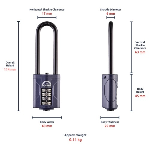 • Squire Combination All Weather Extra Long Shackle Padlock - 40mm Body - 17 x 63mm Shackle - Blue