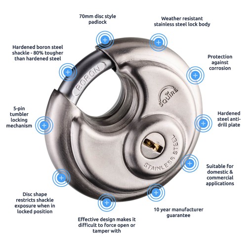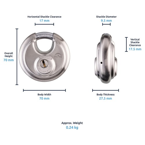 • Squire Disc Padlock - 70mm Body - 17 x 17.5mm Shackle - Keyed Alike - Silver