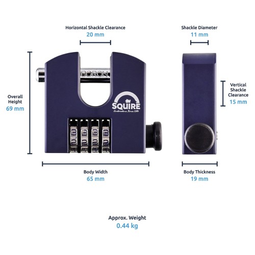 Squire Security Combination Padlock - 65mm Body - 15 x 20 x 75mm Shackle - Blue