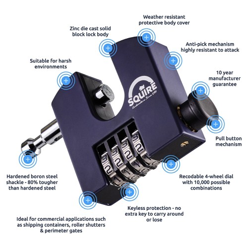 • Squire Security Combination Padlock - 65mm Body - 15 x 20 x 75mm Shackle - Blue