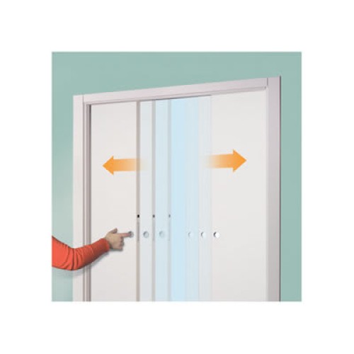 • Through a system of pulleys in the running track, this system links together the opening of both doors so as you open or close one door the other does exactly the same