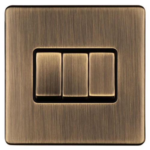 • Eurolite Concealed 10A 3 Gang 2 Way Screwless Flat Plate Light Switch - Antique Brass/Black