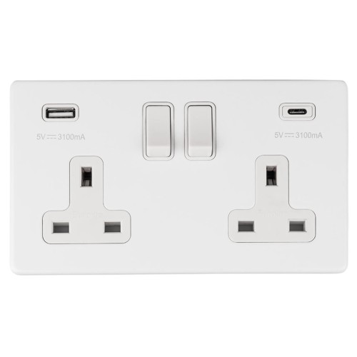 • Eurolite Concealed 13A 2 Gang Screwless Type A/C USB Socket with 2 x USB - 3.1A - Matt White/White