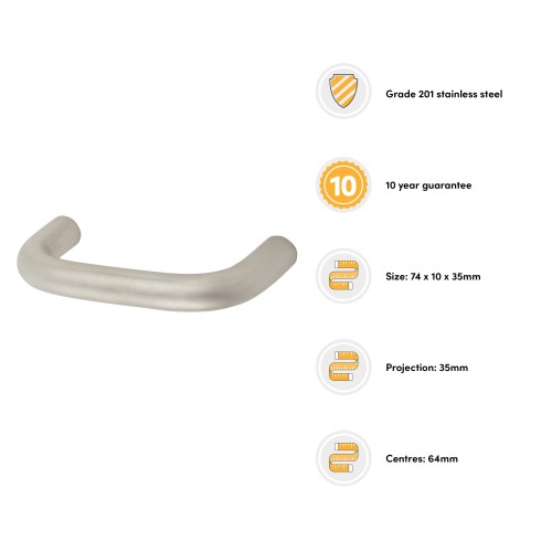 Exel 10mm D-Bar Cabinet Pull Handle - 64mm Centres - Satin Stainless Steel