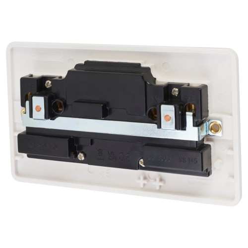 • 2 gang double pole switched socket with a moulded white raised curved edge