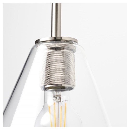 • Contemporary and stylish knurled ceiling light pendant in a satin nickel finish with a clear glass hood shade