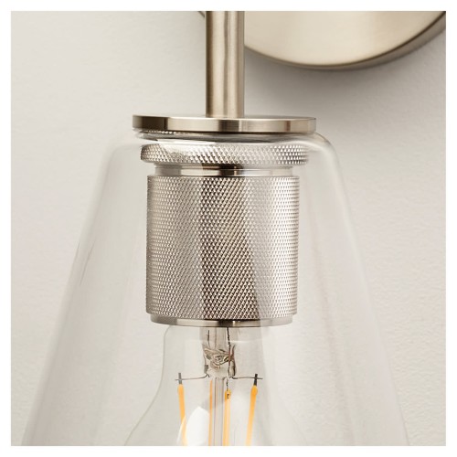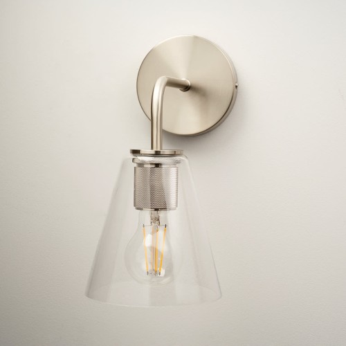 • Contemporary and stylish knurled indoor wall light in a satin nickel finish with a clear glass hood shade