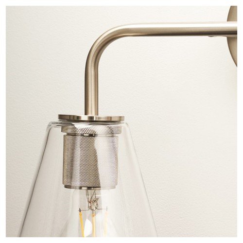 • Contemporary and stylish knurled indoor double wall light in a satin nickel finish with a clear glass hood shades