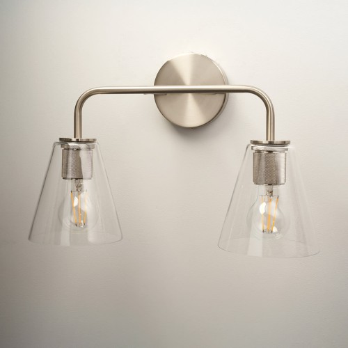 Exel Sabana Knurled 2 Light Indoor Wall Light - Satin Nickel Fittings & Hooded Clear Glass Shades