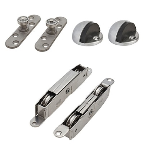 • Contains: 2 x floor mounted stops, pair of stainless steel twin wheel adjustable rollers, pair of stainless steel guides
