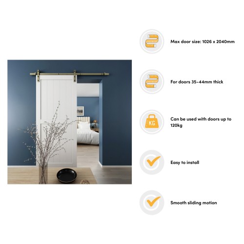 • Kit contents: 1 x 2000mm track, 2 x hangers, 5 x wall spacers, 2 x anti-jump devices, 2 x door stops, 1 x door guide, bolts and fixings – everything needed for one complete installation