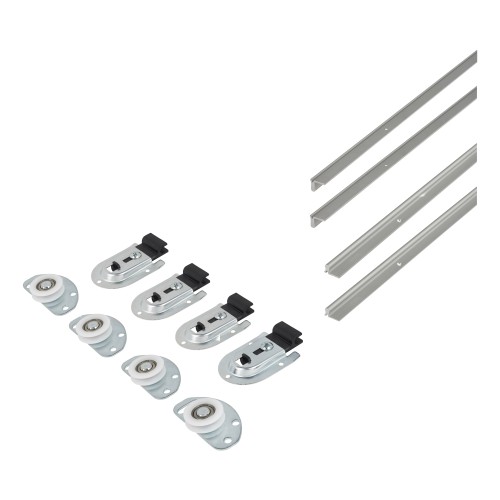 Contains: rollers, guides, top and bottom tracks and screws for a two door system