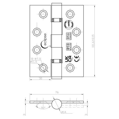 • Eclipse Ball Bearing Marine Grade Butt Fire Door Hinge - 102 x 76 x 3mm - Satin Stainless - Pair