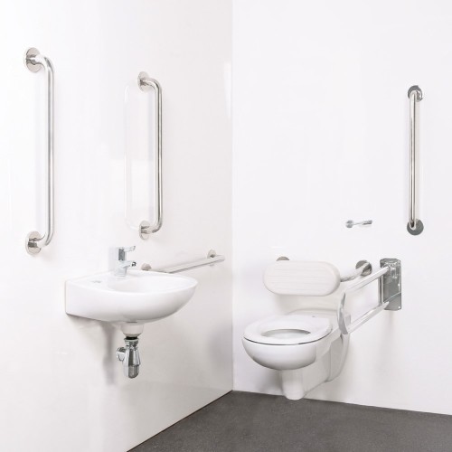 Kit contains: 5 x 600mm steel grab rails, 1 x 800mm lift & lock steel hinged support rail, 1 x back rest rail, 1 x wall hung WC pan, 1 x ring only toilet seat with stainless steel hinge, 1 x two tap hole basin & fittings, 1 x sequential basin mixer tap, 1 x extended spatula cistern lever, 1 x TMV3 in-line thermostatic valve (optional), 1 x WRAS approved cistern fittings, 1 x tap hole cover