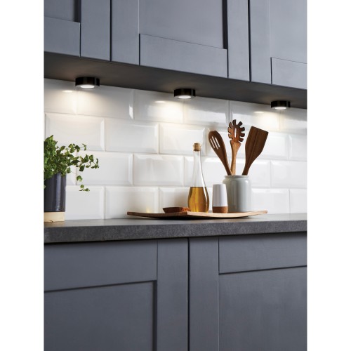 Circular surface mounted under cabinet light that can be wired directly to the mains so no additional driver or transformer is required