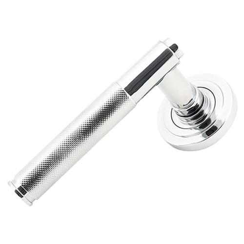 From The Anvil Polished Chrome Knurled Door Handles on Round Art Deco Rose - Brompton Range