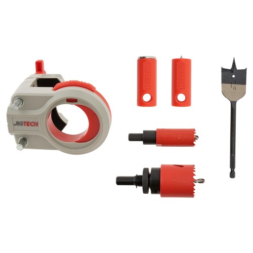 • Jigtech system installation kit containing Jigtech jig, 25mm and 44mm holesaw and arbors, 32mm spade bit, a latch tapper and keep locators for the professional installer
