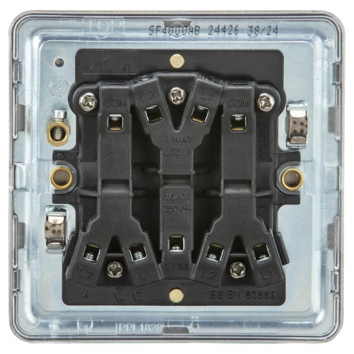 Light switch features a screwless flat plate design that delivers a seamless finish with no visible fixings, for a smooth decorative touch