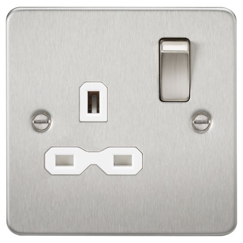 • Knightsbridge 13A 1 Gang Flat Plate Double Pole Switched Socket - Brushed Chrome with White Insert