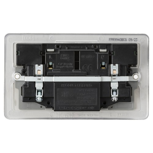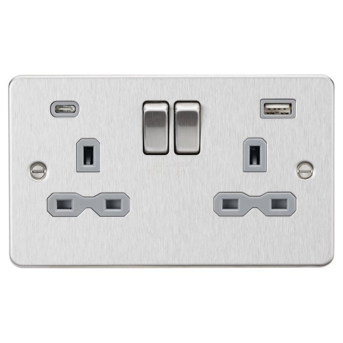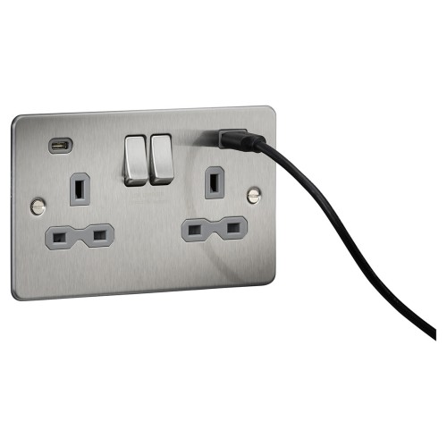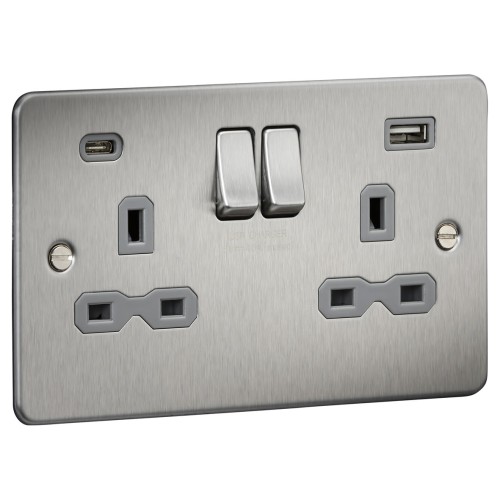 • Knightsbridge 13A 2 Gang Flat Plate Type A/C USB Socket with 2 x USB - 4A - Brushed Chrome/Grey