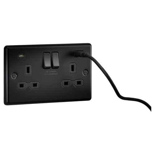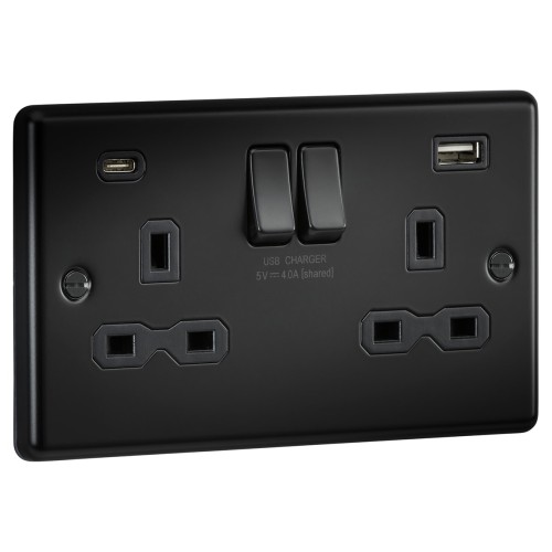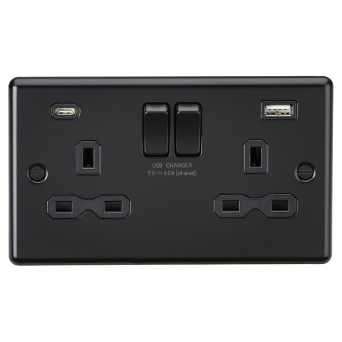 • Knightsbridge 13A 2 Gang Round Edge Type A/C USB Socket with 2 x USB - 4A - Matt Black/Black