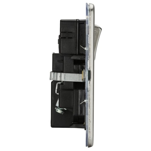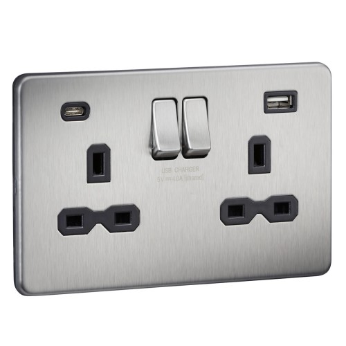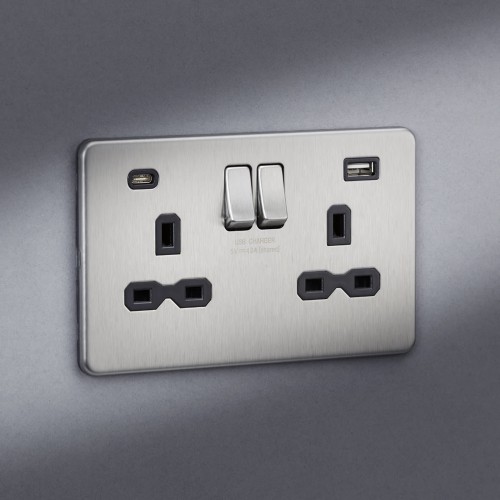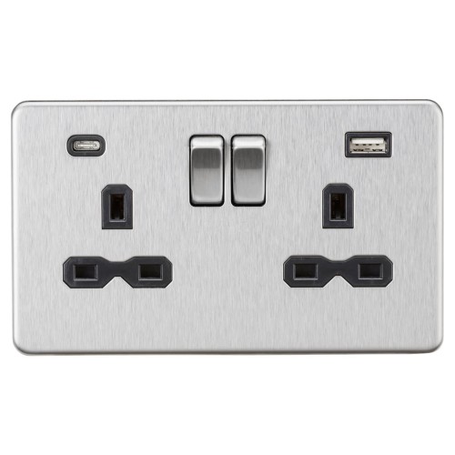 • Knightsbridge 13A 2 Gang Screwless Type A/C USB Socket with 2 x USB - 4A - Brushed Chrome/Black