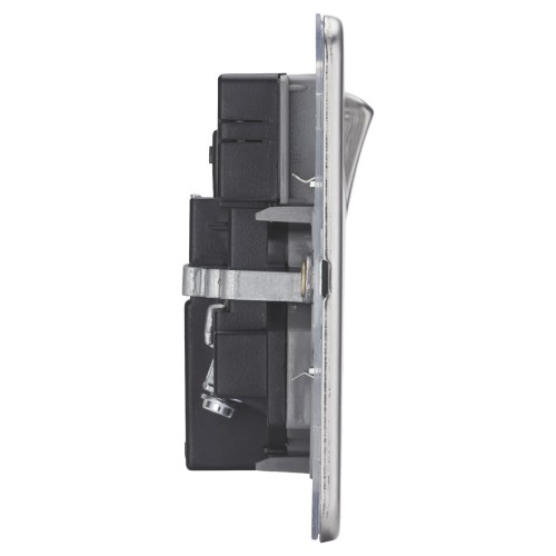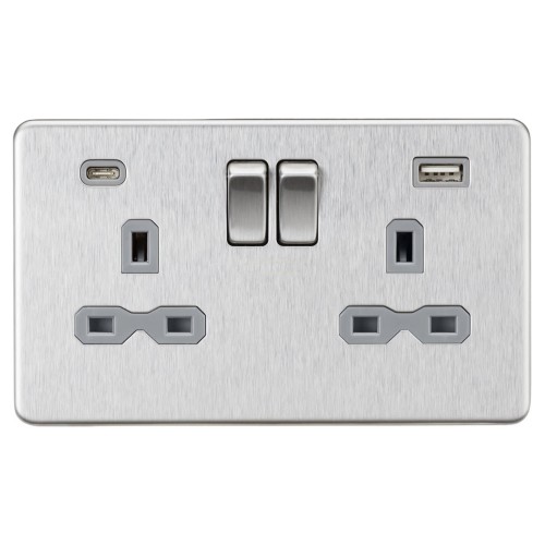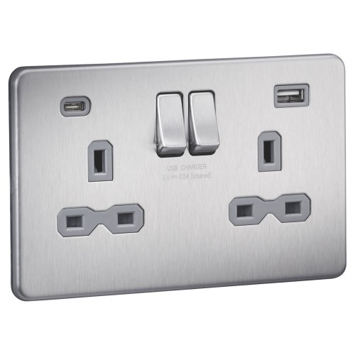 • Knightsbridge 13A 2 Gang Screwless Type A/C USB Socket with 2 x USB - 4A - Brushed Chrome/Grey
