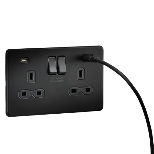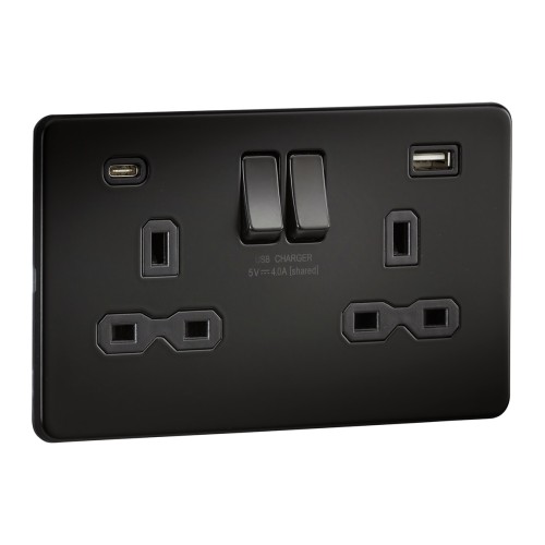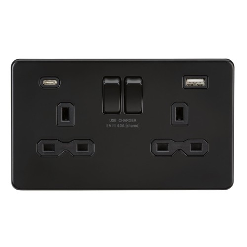 • Knightsbridge 13A 2 Gang Screwless Type A/C USB Socket with 2 x USB - 4A - Matt Black/Black