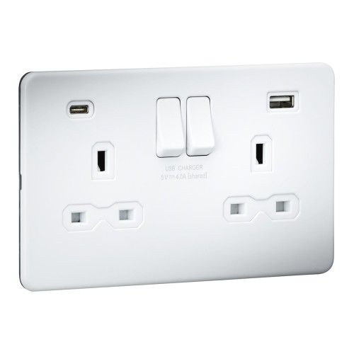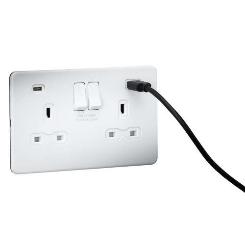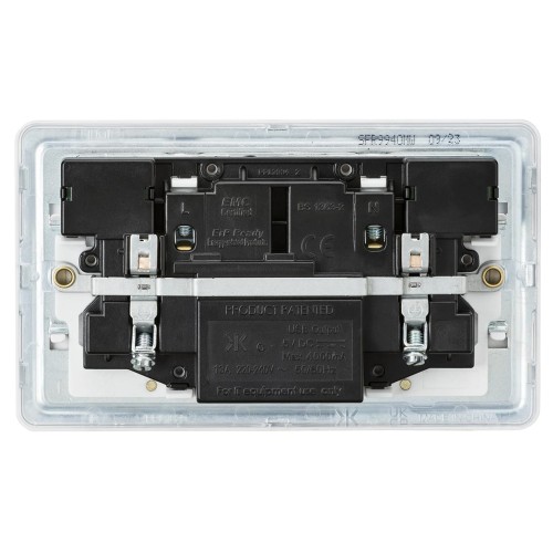 • 13A 2 gang screwless USB socket combines power and style, ideal for charging smartphones, tablets, and other USB-powered devices around the home or office