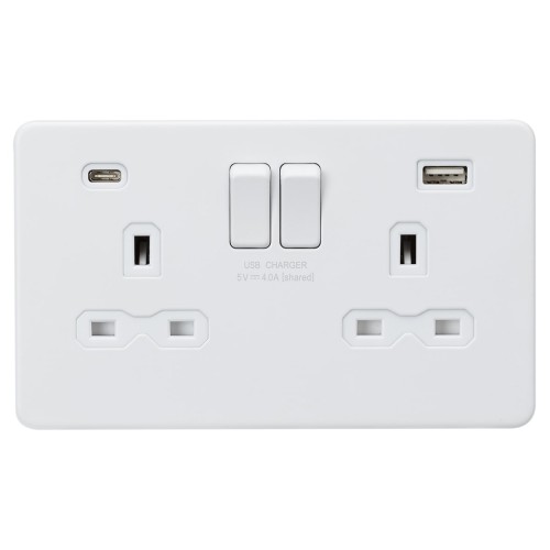 • Knightsbridge 13A 2 Gang Screwless Type A/C USB Socket with 2 x USB - 4A - Matt White/White