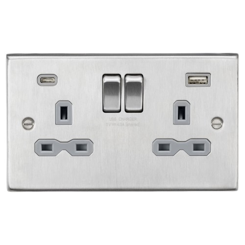 • Knightsbridge 13A 2 Gang Square Edge Type A/C USB Socket with 2 x USB - 4A - Brushed Chrome/Grey
