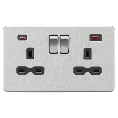 • Knightsbridge 13A 2 Gang Type A/C 45W Fastcharge USB Socket with 2 x USB - Brushed Chrome/Black