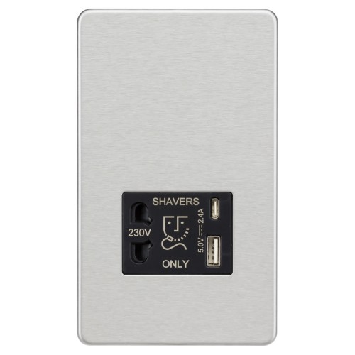 • Knightsbridge 230V Shaver Socket with Type A/C USB Ports - 2.4A - Brushed Chrome with Black Insert