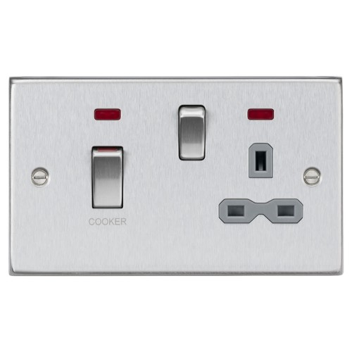 Knightsbridge 45A Square Edge DP Cooker Switch & 13A Socket & Neons - Brushed Chrome & Grey Insert