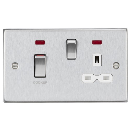 Knightsbridge 45A Square Edge DP Cooker Switch & 13A Socket & Neons - Brushed Chrome & White Insert